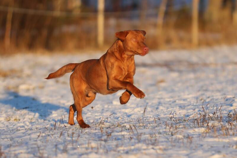 Appearance: Brue is a striking, working-type Labrador with a handsome head, a muscular build, and a strong, sturdy bone structure. In our opinion, he's one of the finest-looking Labradors out there, maintaining a healthy weight of 34-35kg. His coat is a dark red, with no white markings—truly a stunning example of the breed.